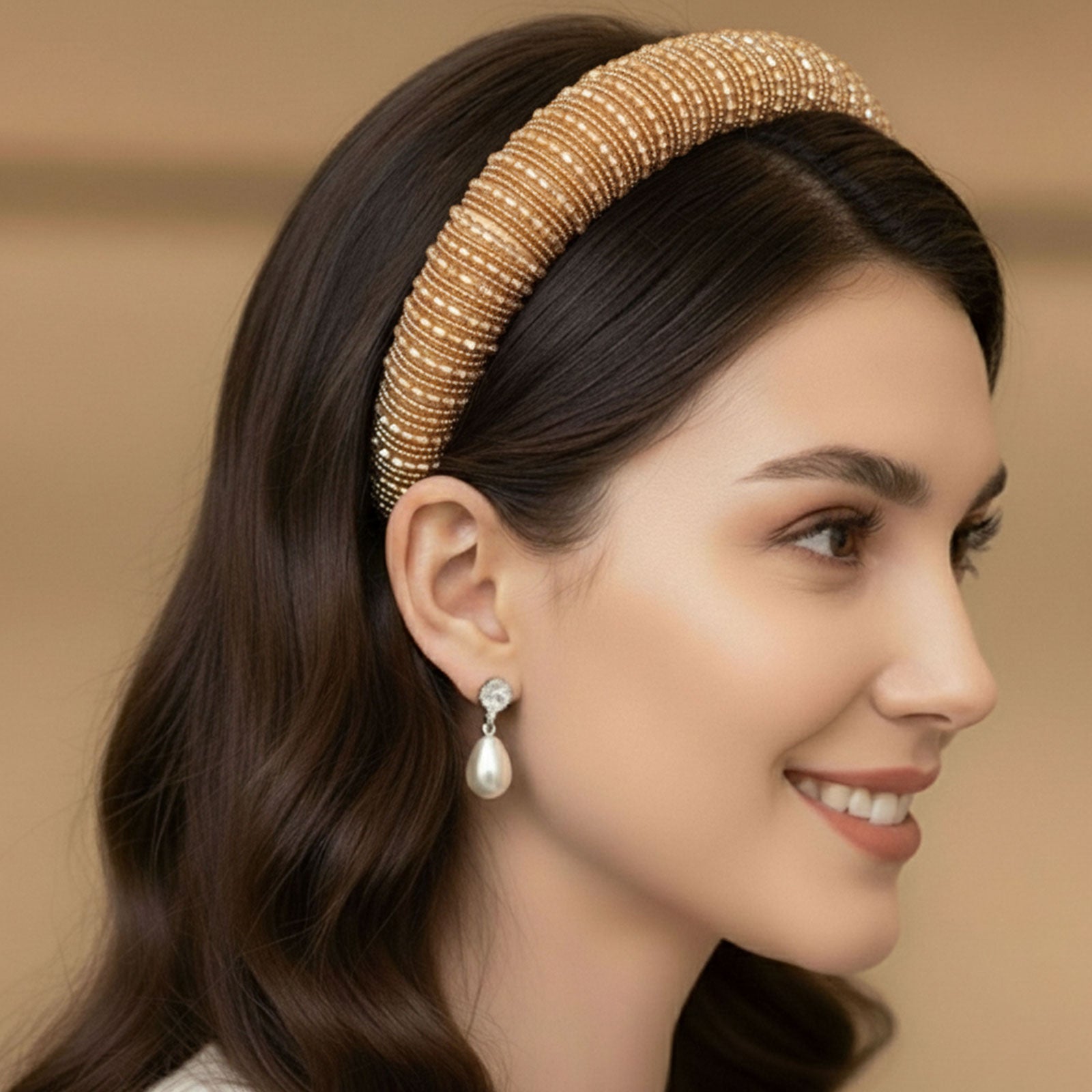 Apportez une touche lumineuse et raffinée à vos coiffures avec le serre-tête large doré en perles facettées. Ses reflets scintillants captent la lumière et illuminent vos looks avec élégance.