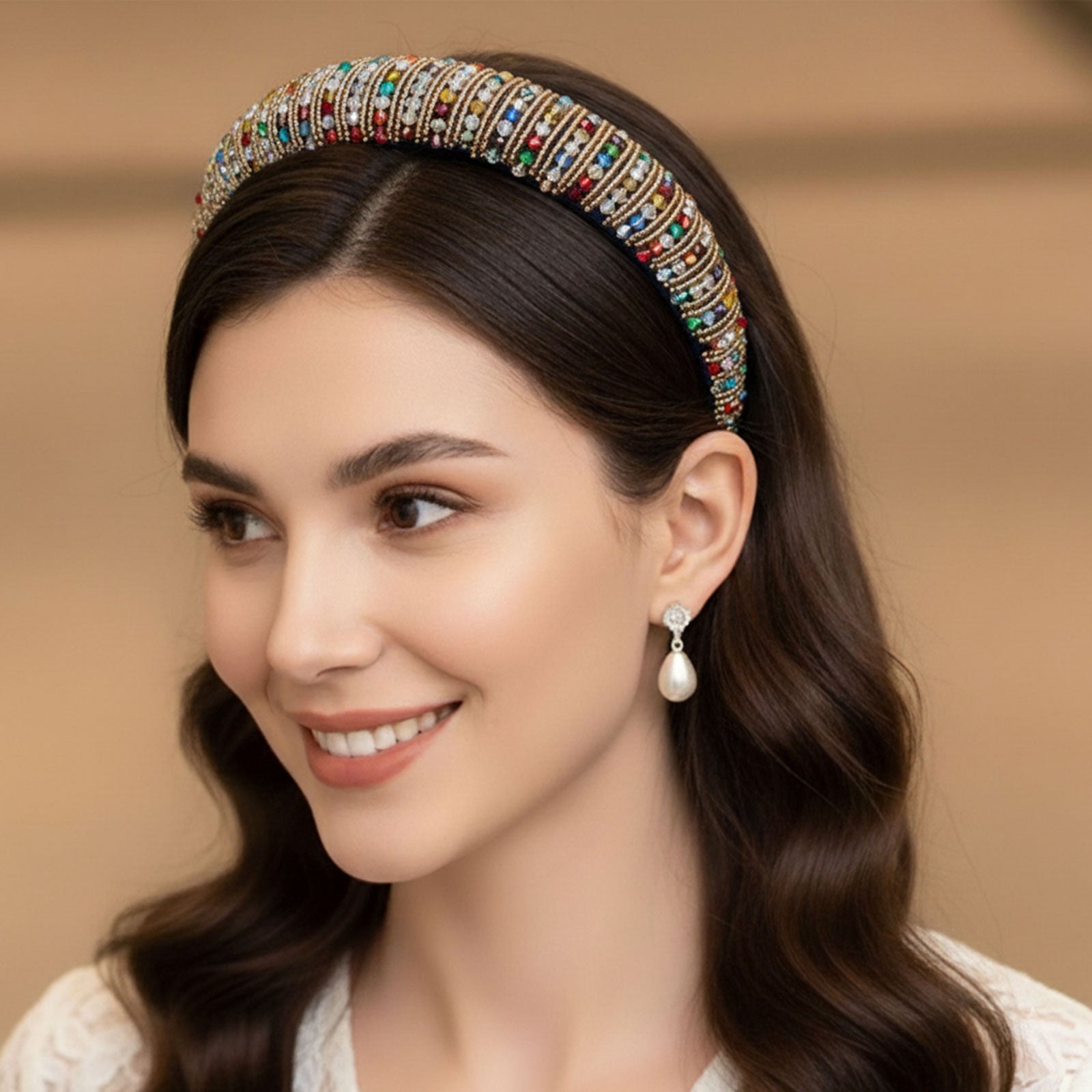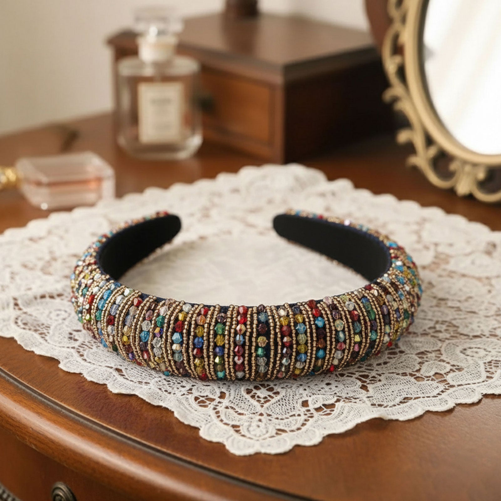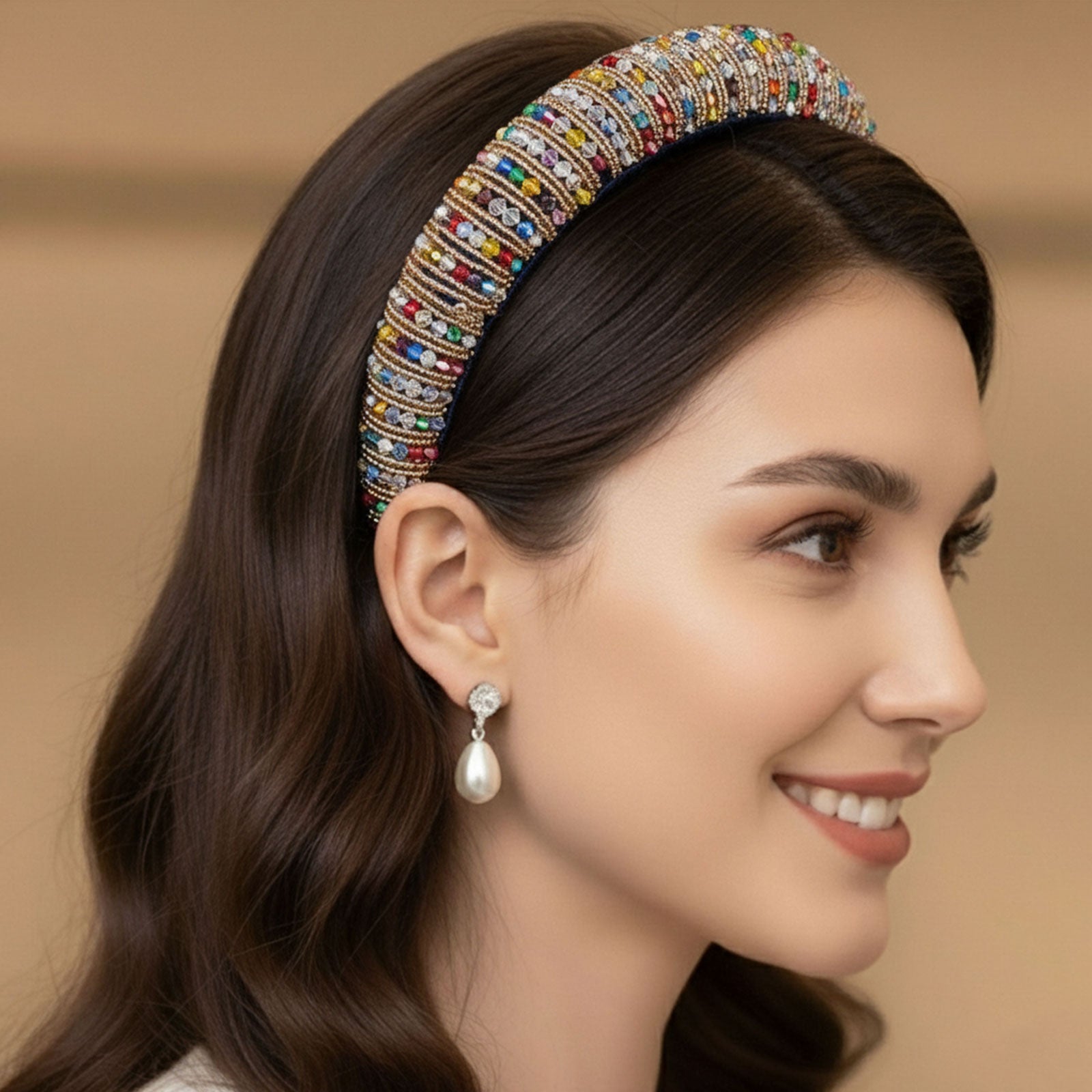 Matière : Base en tissu doux, ornée de perles facettées et de séparateurs métalliques raffinés