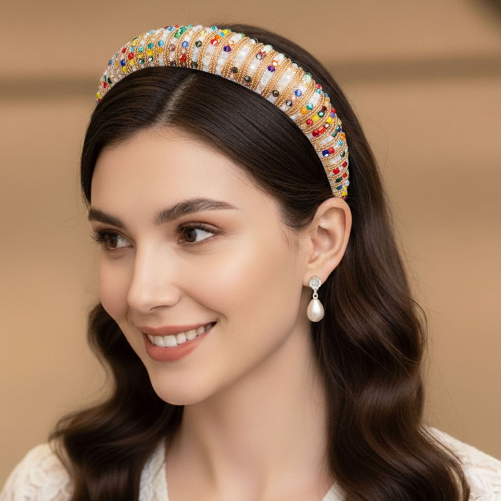 Apportez une touche colorée et raffinée à vos coiffures avec le Serre-tête Large Angie Mosaïque Bohème. Orné de cristaux multicolores facettés et de finitions dorées élégantes, il reflète la lumière avec éclat et originalité.