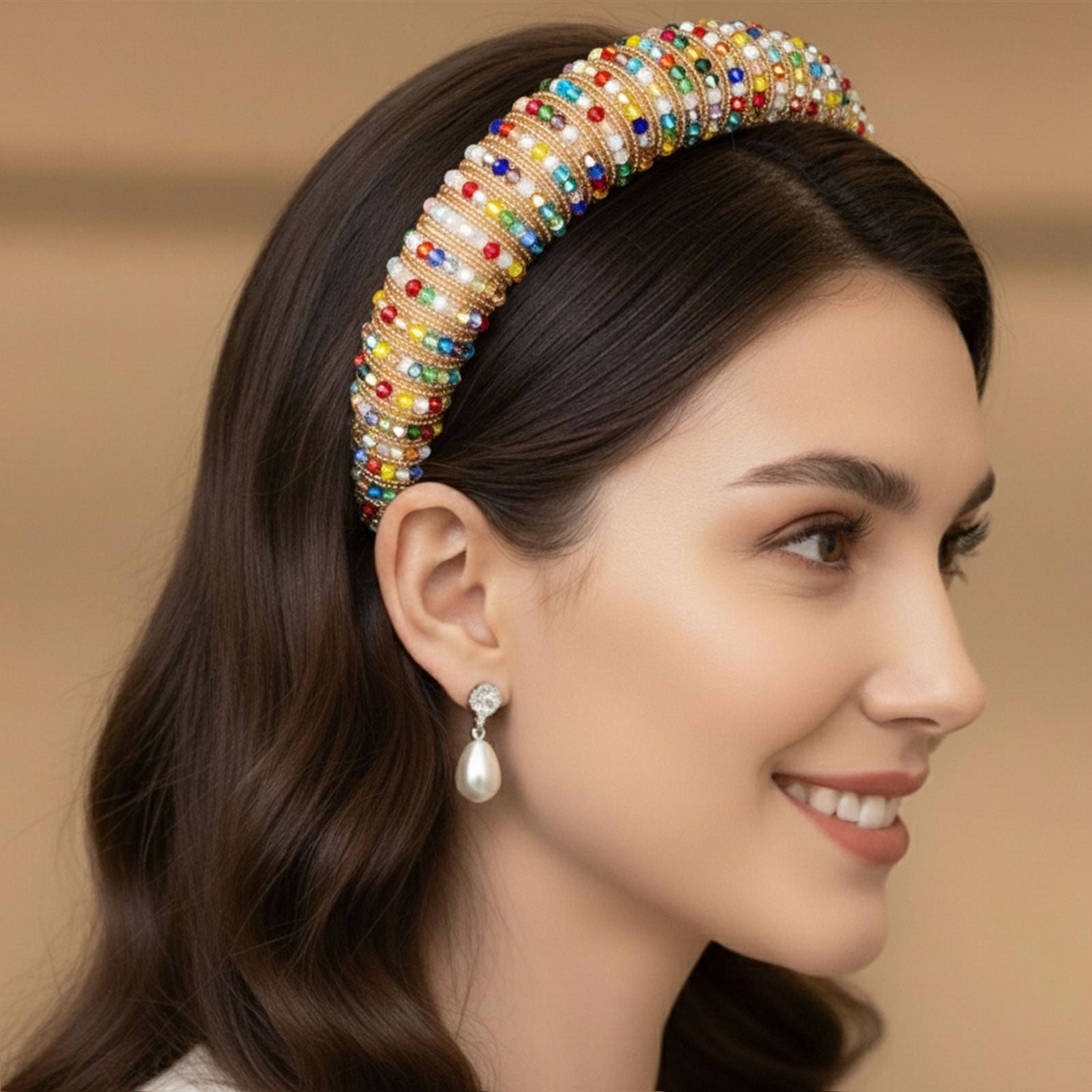 Matière : Base en tissu doux, ornée de perles facettées et de séparateurs métalliques raffinés