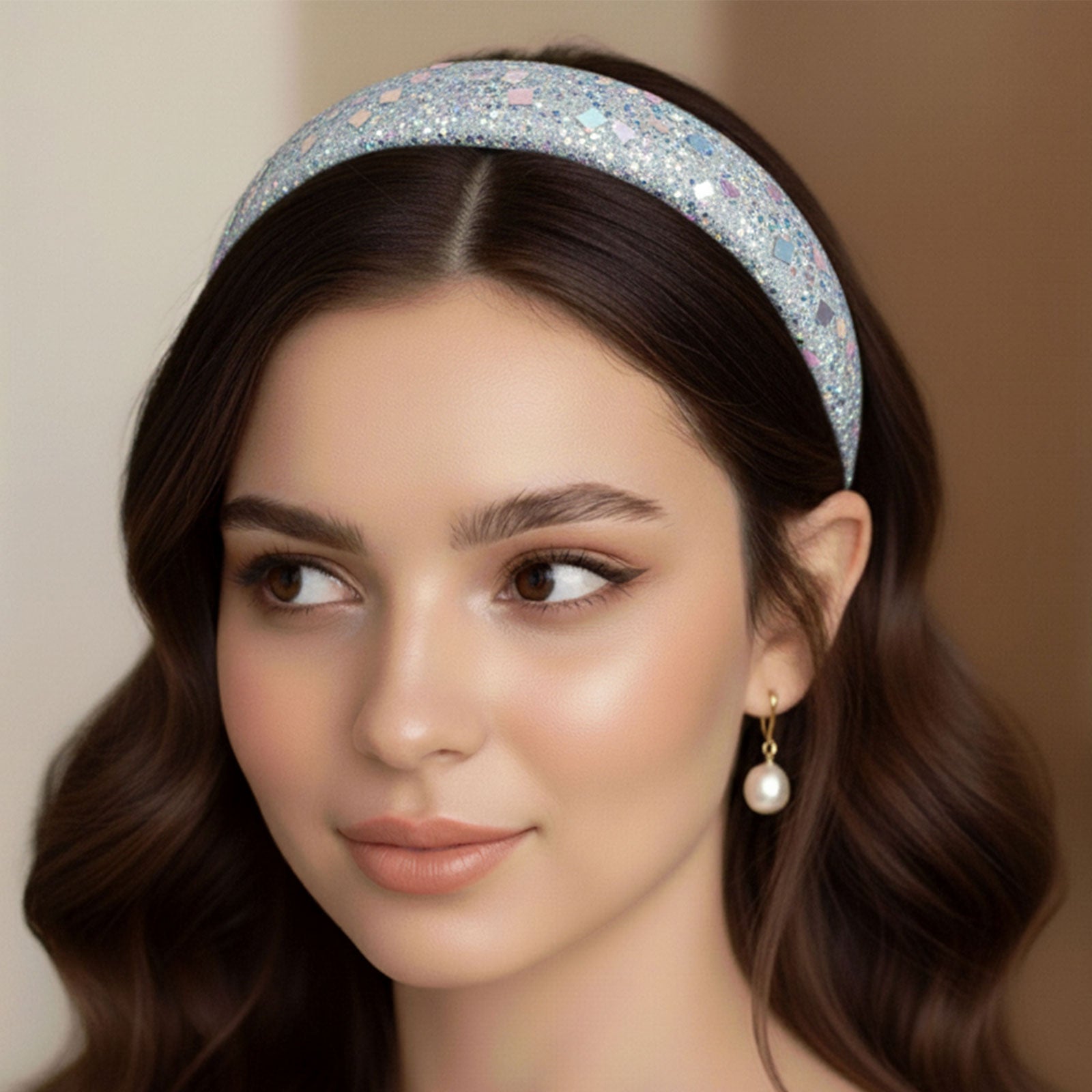 Brillez de mille feux avec le Serre-tête Large Peggy Glitter Cloud Argenté. Recouvert de paillettes scintillantes aux reflets irisés, il capte la lumière et apporte une touche glamour à toutes vos coiffures.