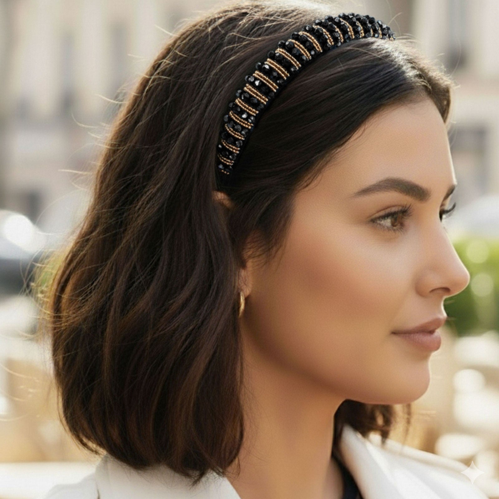 Apportez une touche chic et lumineuse à vos coiffures avec le serre-tête noir orné de perles décoratives dorées. L’association du noir intense et des reflets dorés crée un contraste raffiné qui sublime votre style.